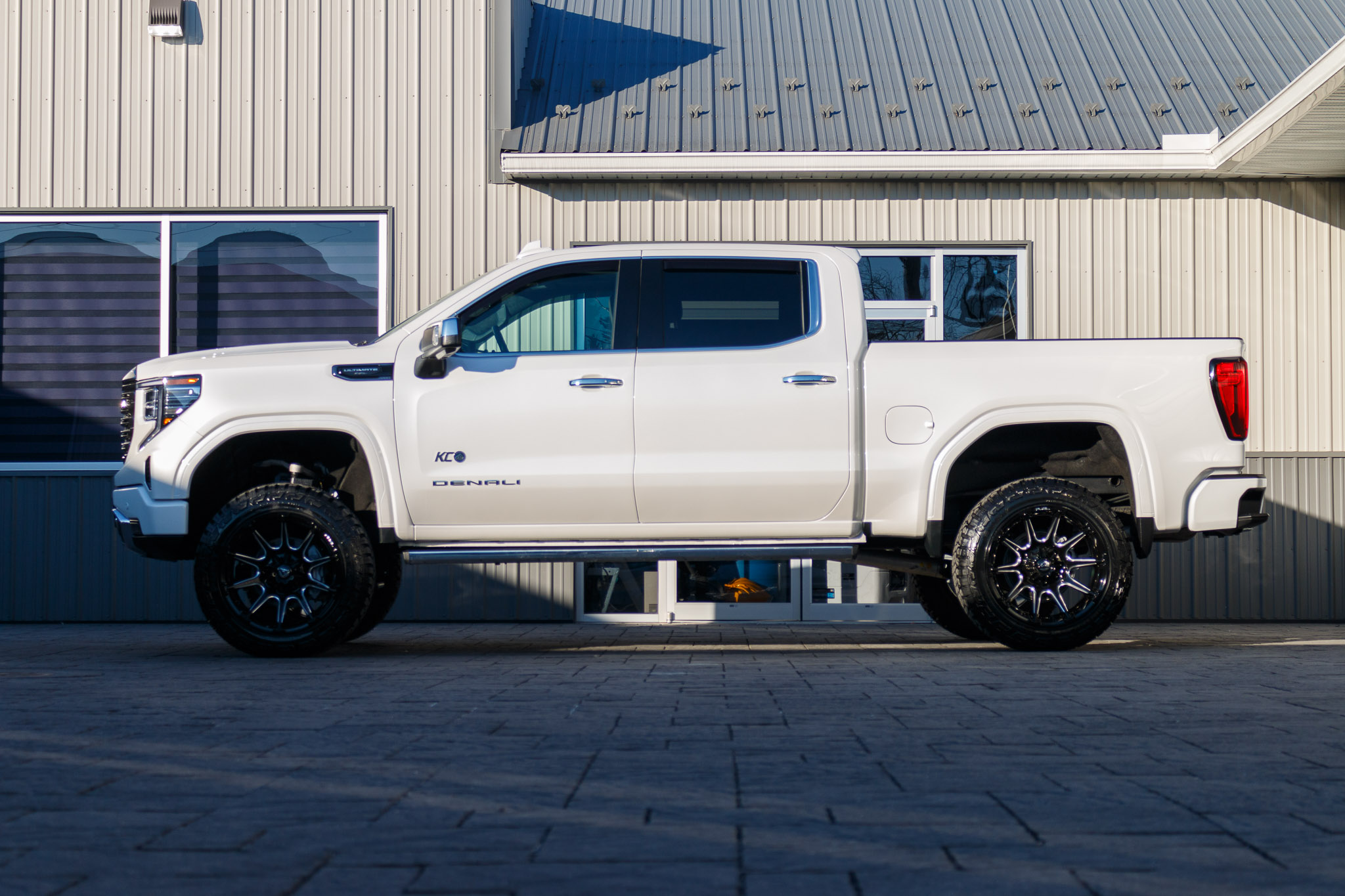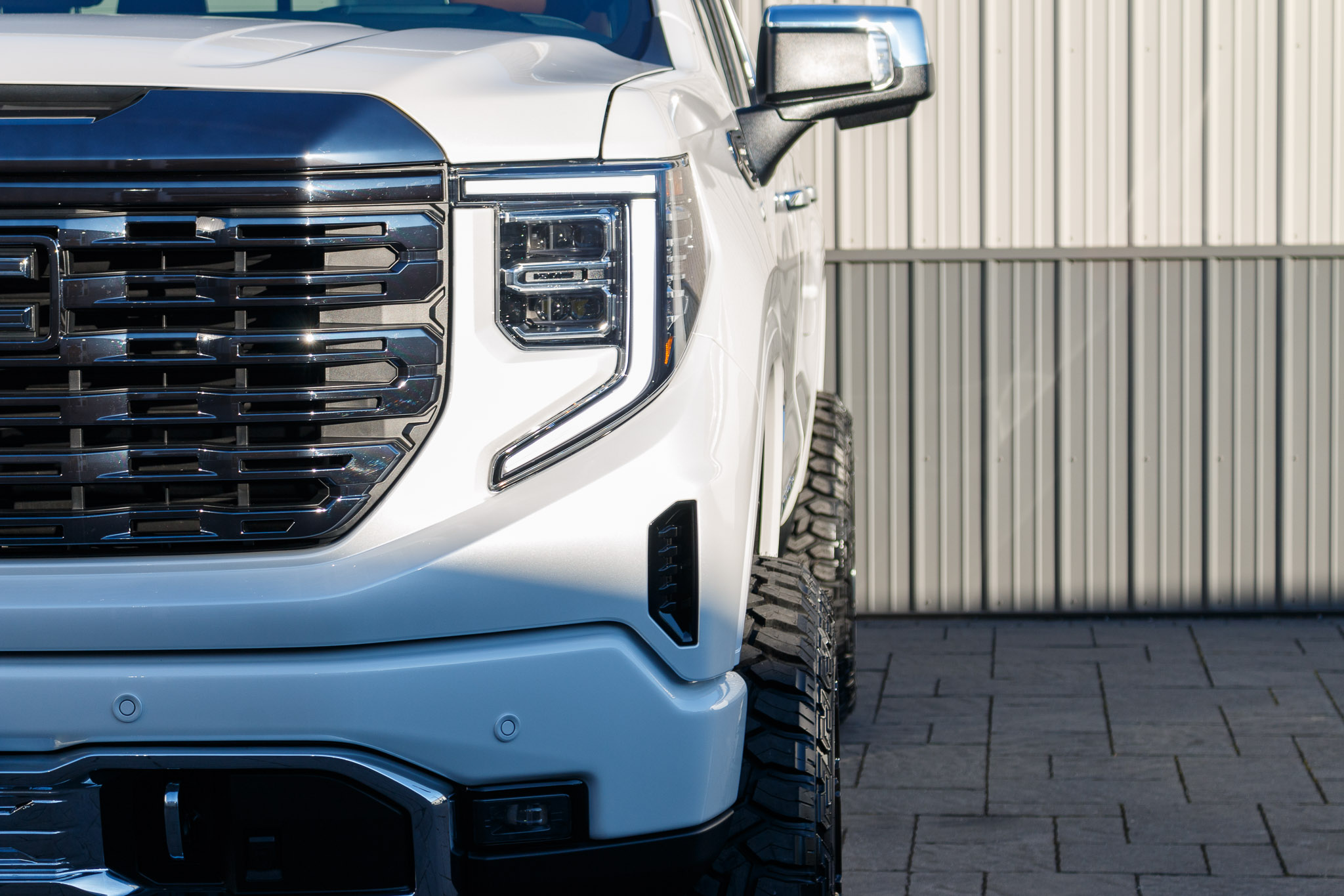 white and black yukon denali sitting on patio pavers with aftermarket lift kit wheels and tires with hood matte black vinyl wrapping and roof matte black vinyl wrapping