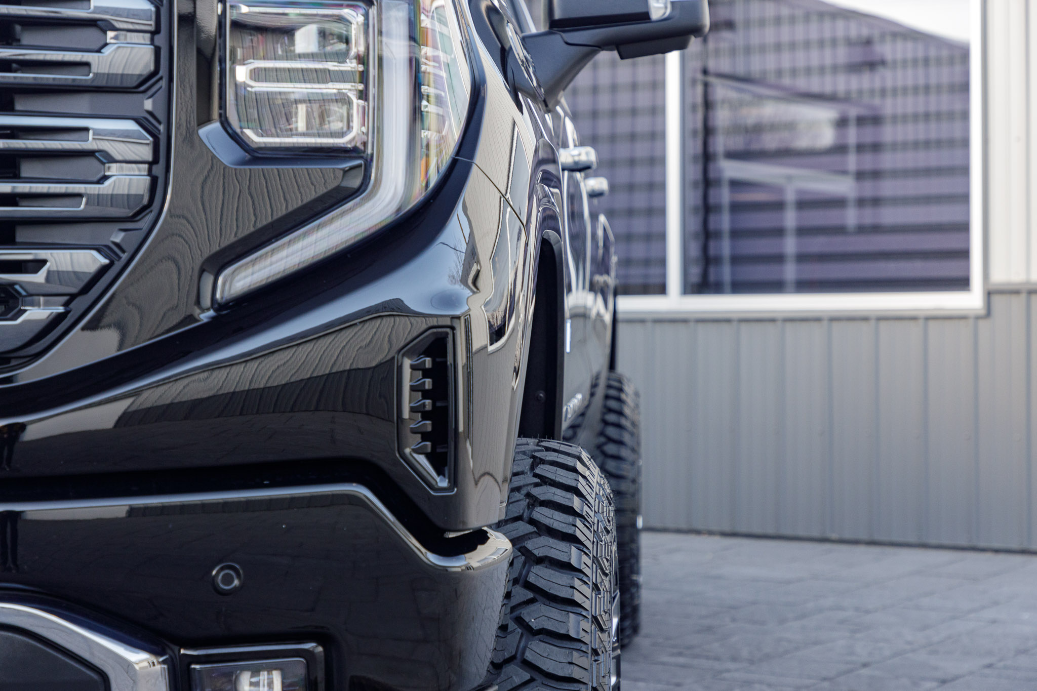 white and black yukon denali sitting on patio pavers with aftermarket lift kit wheels and tires with hood matte black vinyl wrapping and roof matte black vinyl wrapping