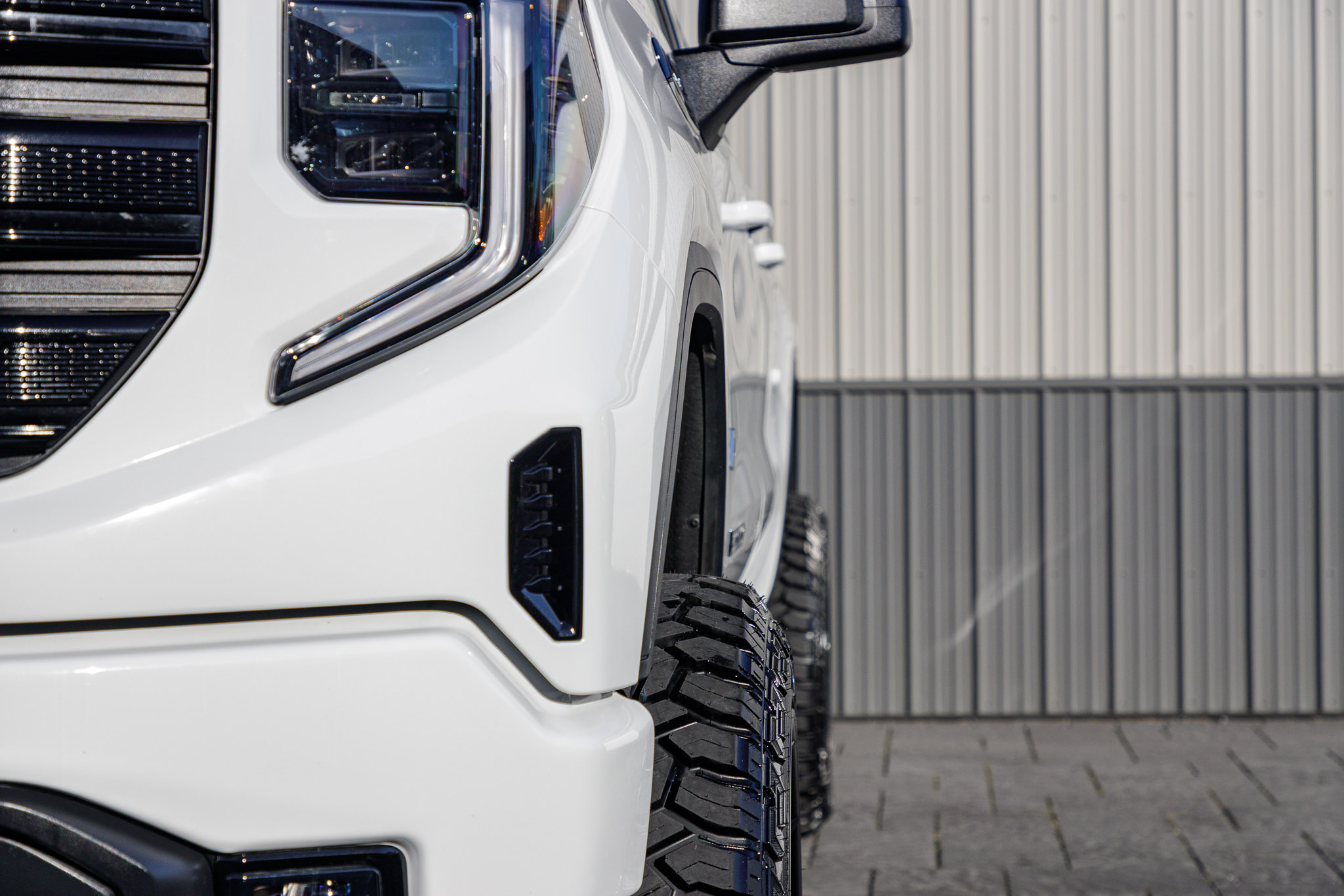 white and black yukon denali sitting on patio pavers with aftermarket lift kit wheels and tires with hood matte black vinyl wrapping and roof matte black vinyl wrapping