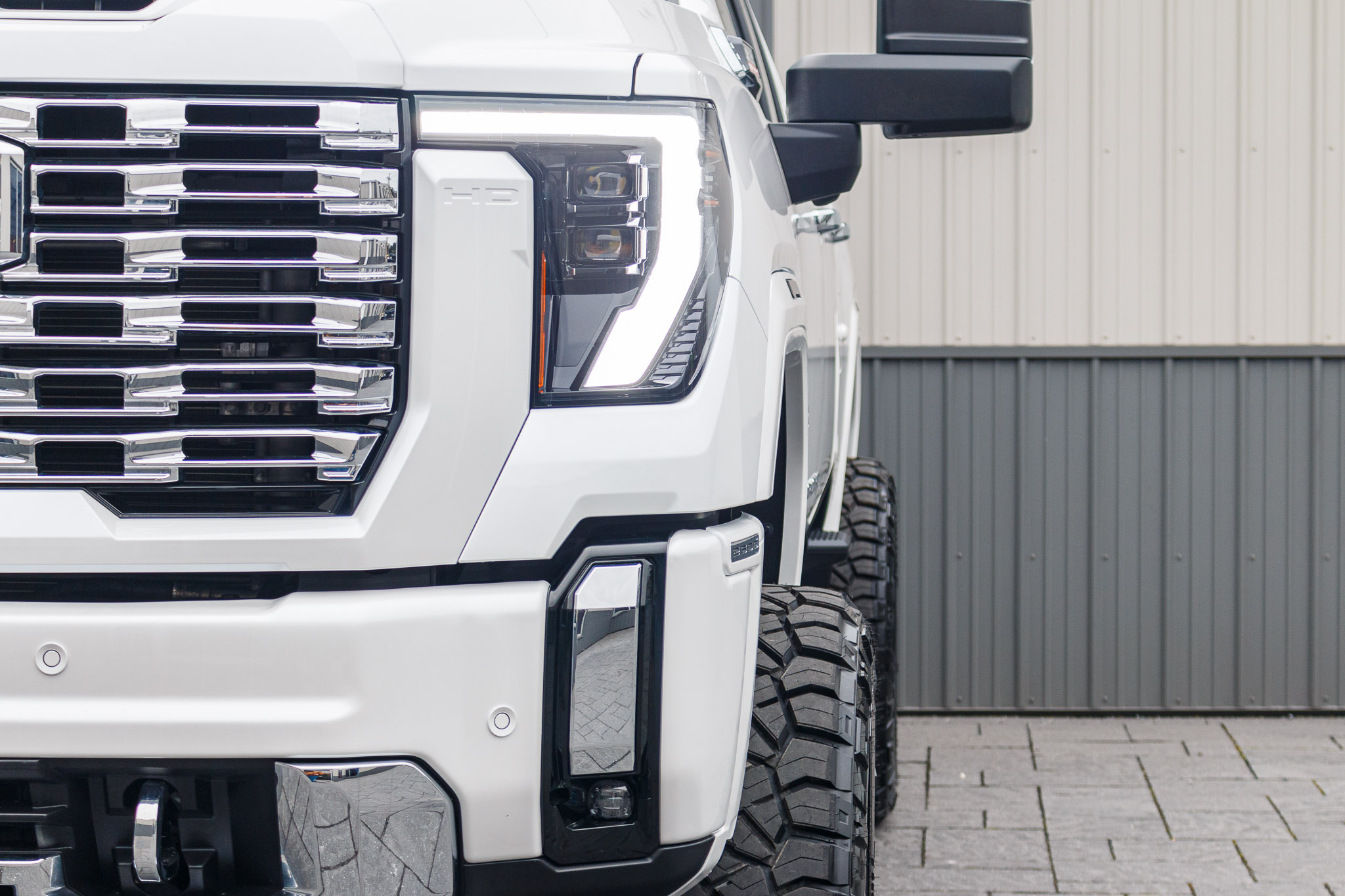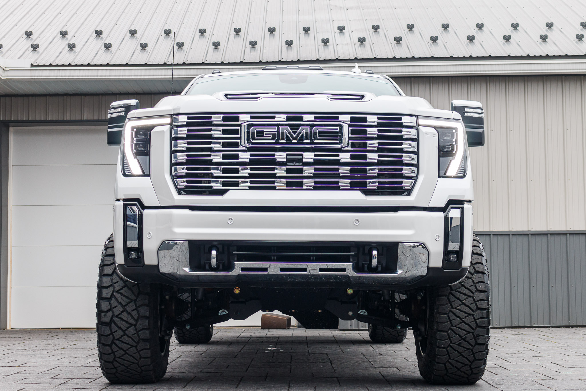 white and black yukon denali sitting on patio pavers with aftermarket lift kit wheels and tires with hood matte black vinyl wrapping and roof matte black vinyl wrapping