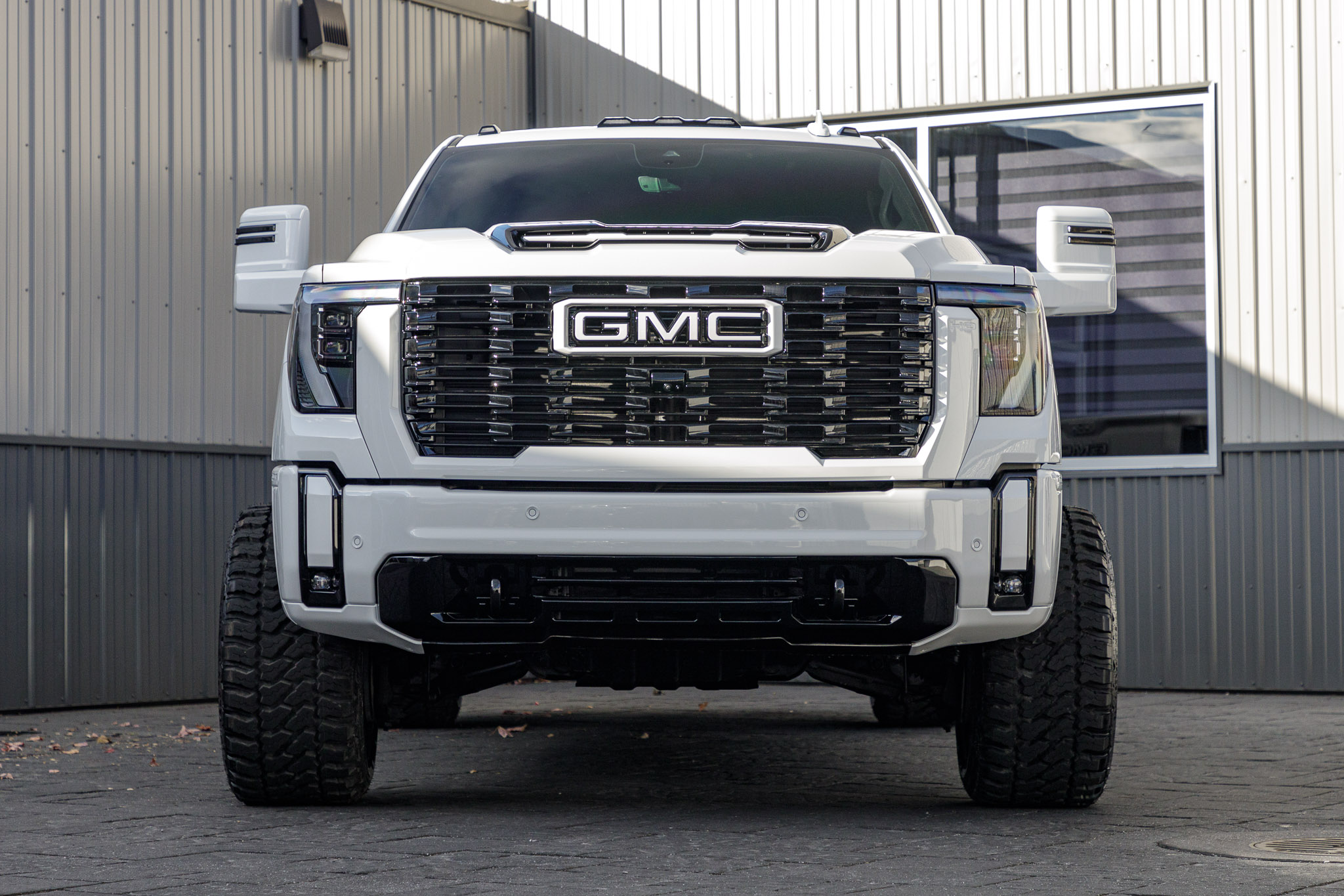 white and black yukon denali sitting on patio pavers with aftermarket lift kit wheels and tires with hood matte black vinyl wrapping and roof matte black vinyl wrapping