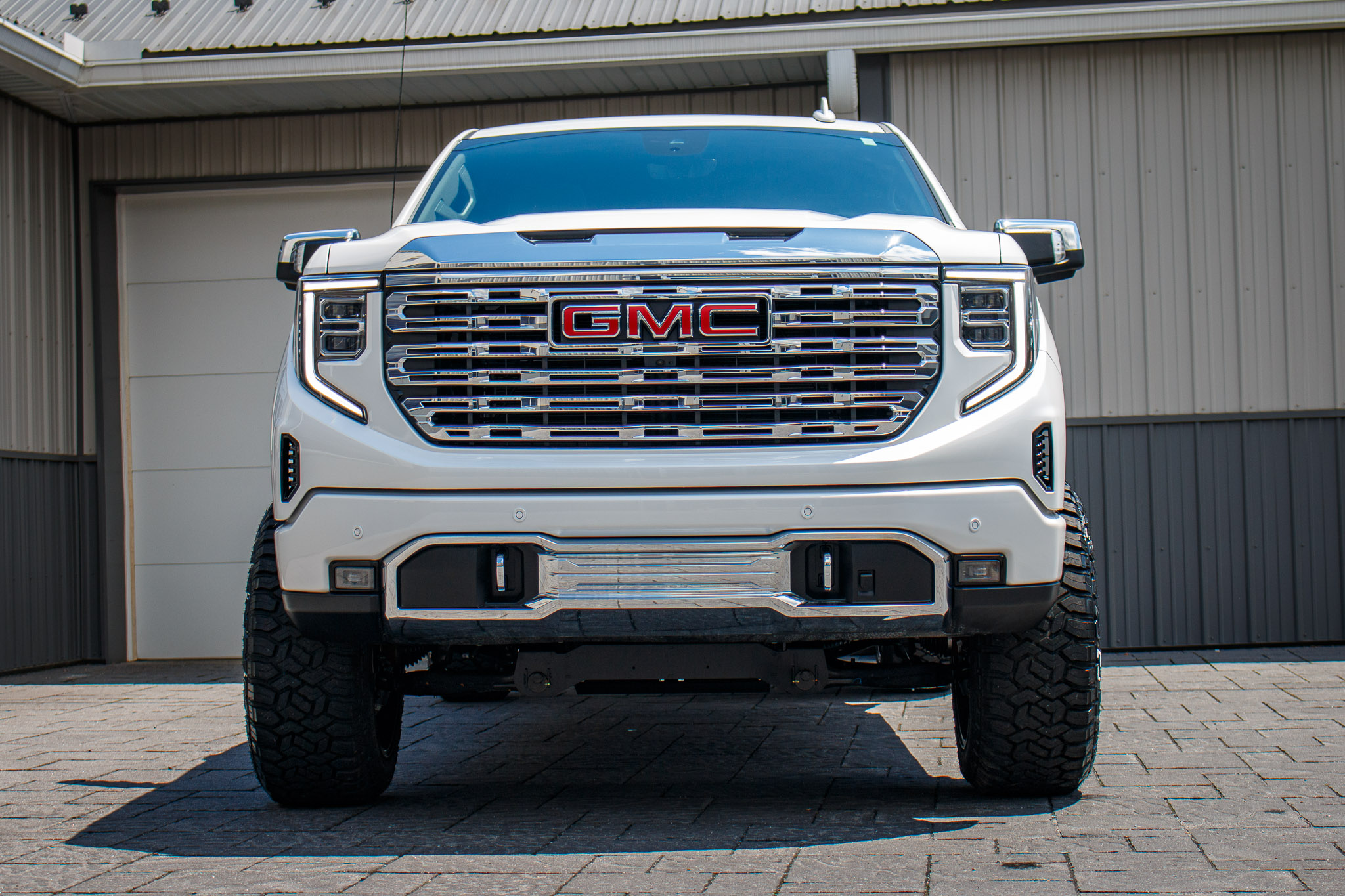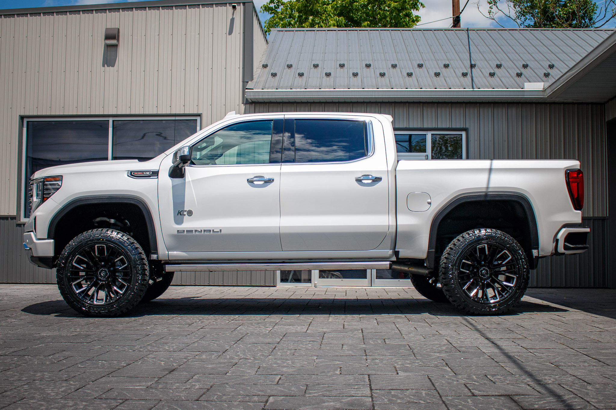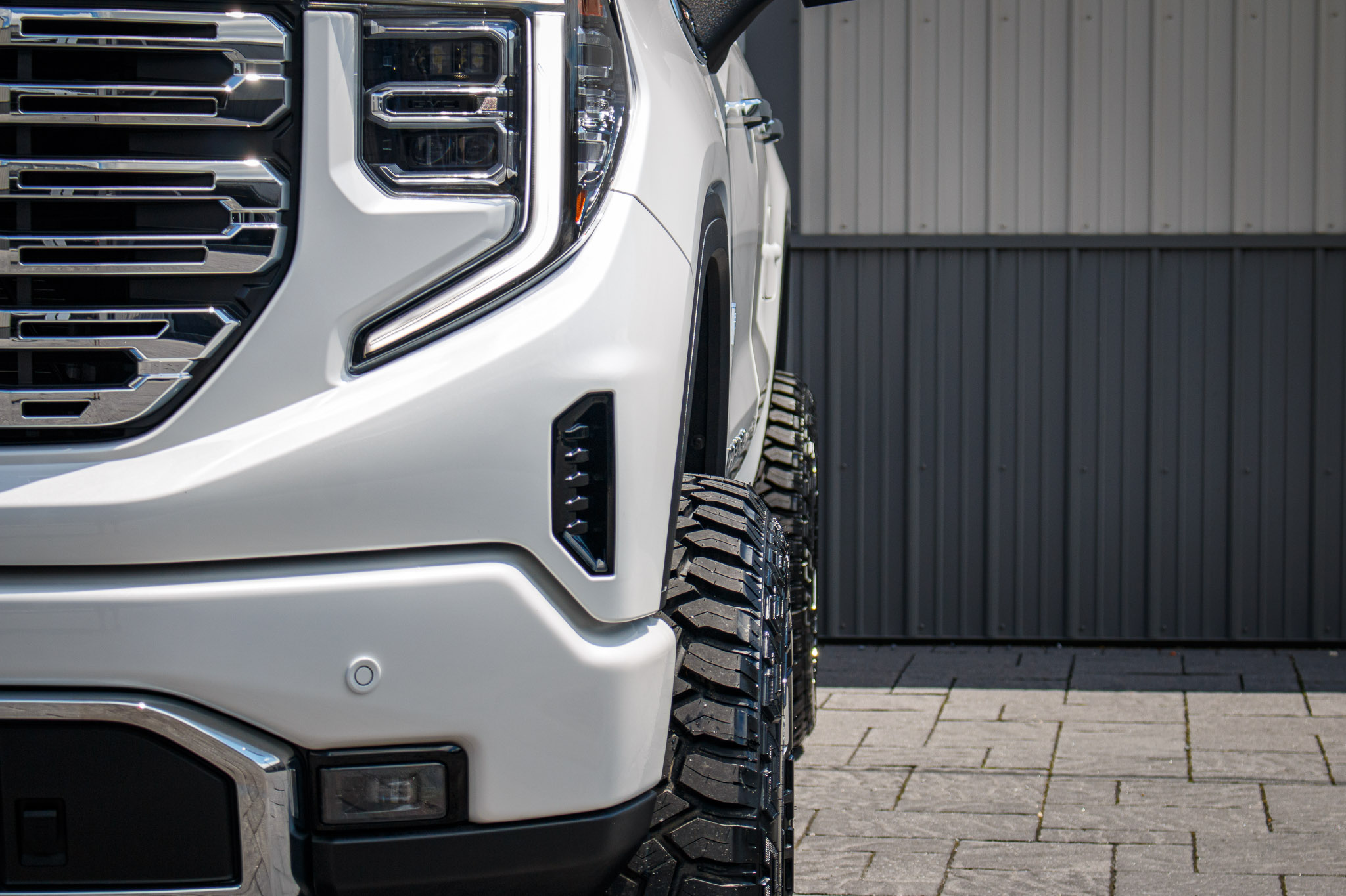 white and black yukon denali sitting on patio pavers with aftermarket lift kit wheels and tires with hood matte black vinyl wrapping and roof matte black vinyl wrapping