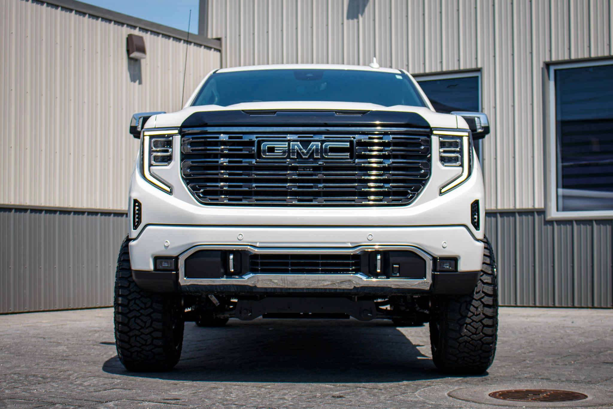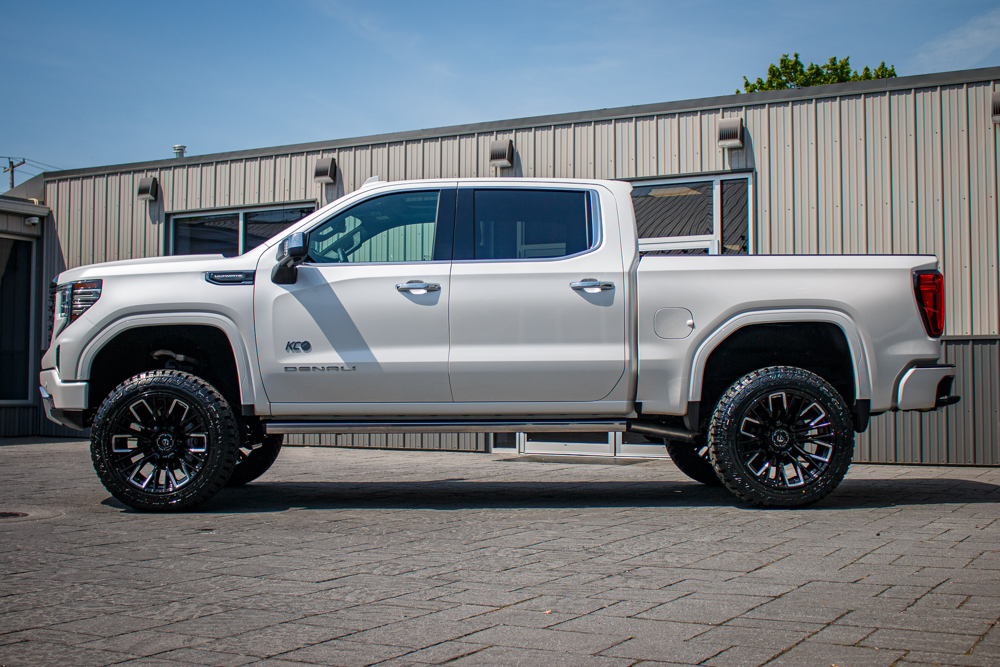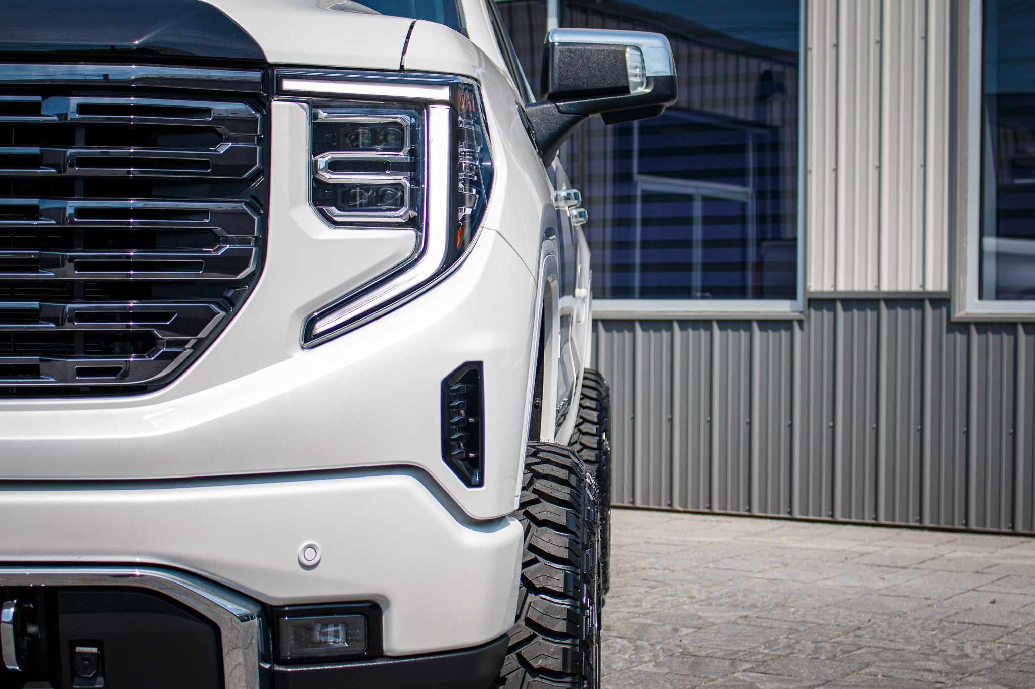 white and black yukon denali sitting on patio pavers with aftermarket lift kit wheels and tires with hood matte black vinyl wrapping and roof matte black vinyl wrapping