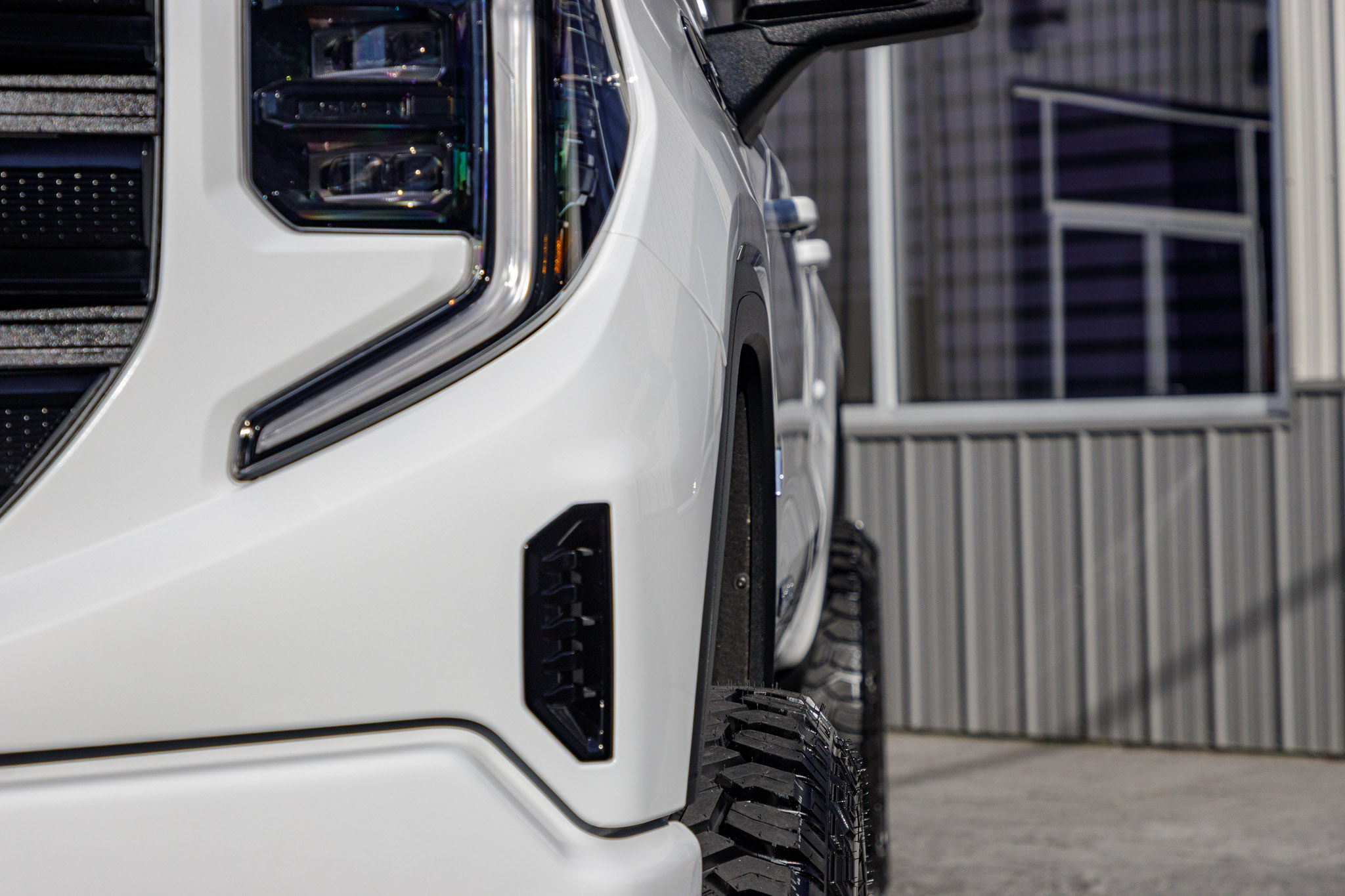 white and black yukon denali sitting on patio pavers with aftermarket lift kit wheels and tires with hood matte black vinyl wrapping and roof matte black vinyl wrapping