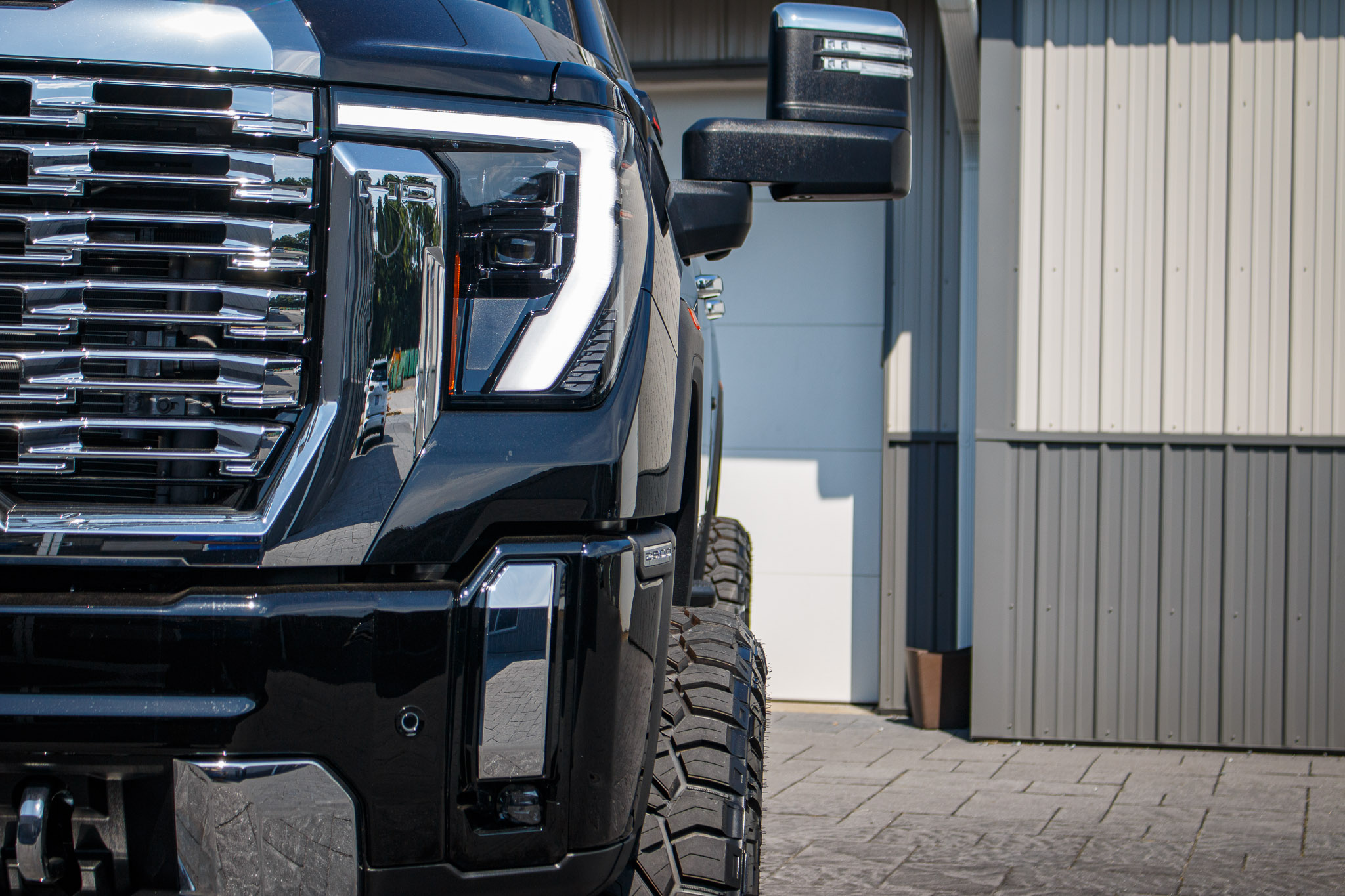 white and black yukon denali sitting on patio pavers with aftermarket lift kit wheels and tires with hood matte black vinyl wrapping and roof matte black vinyl wrapping