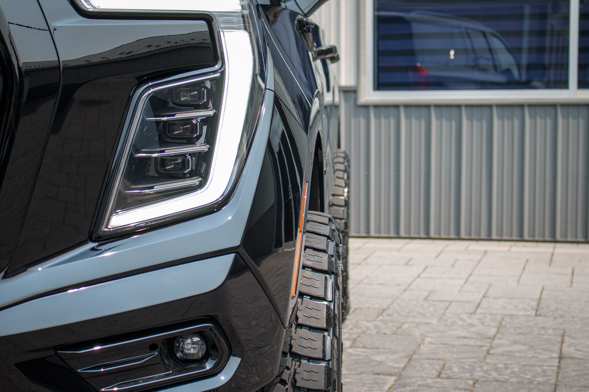 white and black yukon denali sitting on patio pavers with aftermarket lift kit wheels and tires with hood matte black vinyl wrapping and roof matte black vinyl wrapping