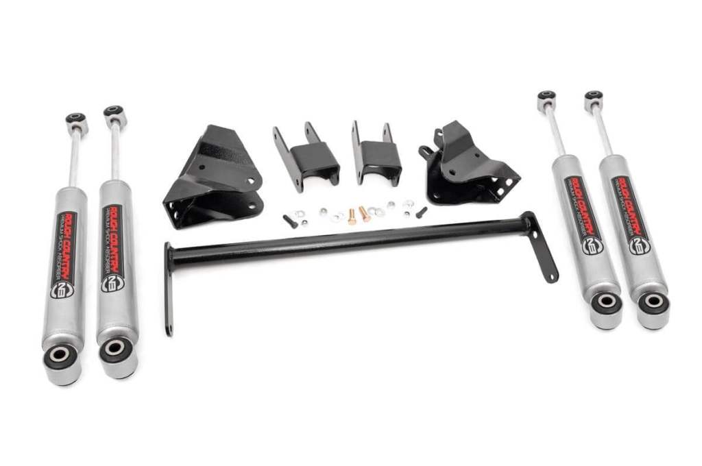 If you want to alter the look of your Ford F-250 or F-350 Super Duty pickup truck, Rough Country???s 1.5-inch Leveling Kit is the easiest way to go! At stock height, Ford???s Super Duty trucks sit higher in the rear giving your truck a "nose-down" look. This easy-to-install kit raises the front of your truck 1.5-inches leveling the front with the rear for a vastly improved appearance and additional ride height resulting in the capability to run up to 33-inch tires.The 100% bolt-on installation process makes this leveling kit incredibly easy to install, even in a home garage with common tools. These solid, cast steel spacers are designed with a slight lip allowing the spacer to lock into the factory seat eliminating any guess work in lining it up allowing you to easily match the factory angle and orientation for a perfect fit.