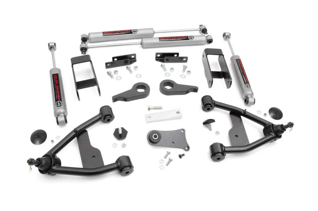 Built to Withstand. Rough Country's 2" Lift Kit for Chevy/GMC is an easy-to-install, bolt-on lift kit and includes everything you need to go from stock height to a lifted truck look. The easy bolt-on installation features lifted coil springs for the front and add-a-leaf springs for the rear. Each kit also comes with four premium N3 series shock absorbers. Backed by Rough Country's limited lifetime replacement warranty, you can count on long-lasting performance from this Chevy/GMC lift kit!
