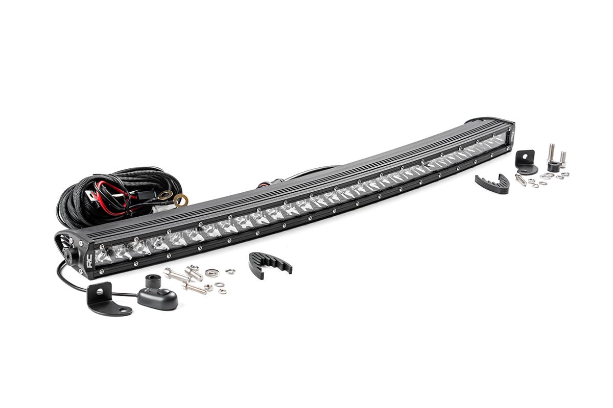 Command the Dark: Light up the night and stay on the trails longer with Rough Country's sleek 30-inch Curved Single Row CREE LED Light Bar. This powerful light bar offers 12,000 lumens of illumination and 150 watts of energy-efficient output, all housed in a stylish, modern frame. Featuring 30 high-intensity 5-watt CREE LEDs, it delivers superior brightness and durability for any adventure.The sleek chrome panel design complements vehicles with chrome accents, such as grilles, wheels, bull bars, or steps. Designed for all-weather performance, this light bar comes with a durable die-cast aluminum housing, ensuring maximum strength and heat dissipation. It???s also backed by an IP67 waterproof rating, providing reliable performance even in harsh conditions.Installation is made simple with the included premium, flat-wound wiring harness, complete with an on/off switch for easy operation. The light bar also features Rough Country's Light Bar Noise Silencers, designed to eliminate unwanted hums, whistles, and wind noise typically found in mounted LED light bars.This light bar includes both end mounts and adjustable post mounts, offering multiple mounting options for maximum versatility. A snap-on cover protects the lens, while Moisture Breather technology reduces moisture build-up inside the light. Plus, it???s all backed by a 3-year warranty for peace of mind.
