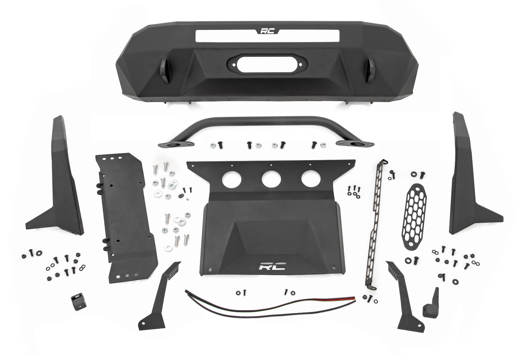 Features High-Clearance Pre-Runner Design: Aggressive pre-runner styling enhances approach angles for superior off-road performance while giving your Tacoma a bold, rugged look.\ Modular Configuration: Fully modular design allows you to customize your bumper setup to match your exact needs and preferences.\ Optional LED Upgrade Kit: Add Rough Country's 20-Inch Single Row LED Light Bar, available with or without White DRL feature, delivering a powerful 7200 lumens for maximum visibility.\ Integrated Trim Panels: Includes trim panels designed specifically for seamless installation of the optional LED light.\ Winch-Ready Design: Comes with a pre-installed winch mounting plate to accommodate your off-road recovery needs.\ Optional Winch Upgrade Combos: Compatible with Rough Country PRO9500S or PRO12000S winches for ultimate recovery power.\ Durable Black Powder Coat Finish: Long-lasting black finish resists corrosion, scratches, and daily wear while maintaining a sleek, aggressive look.\ D-Ring Recovery System: Includes D-Ring mounts and heavy-duty D-Rings for reliable recovery points on the trail.
