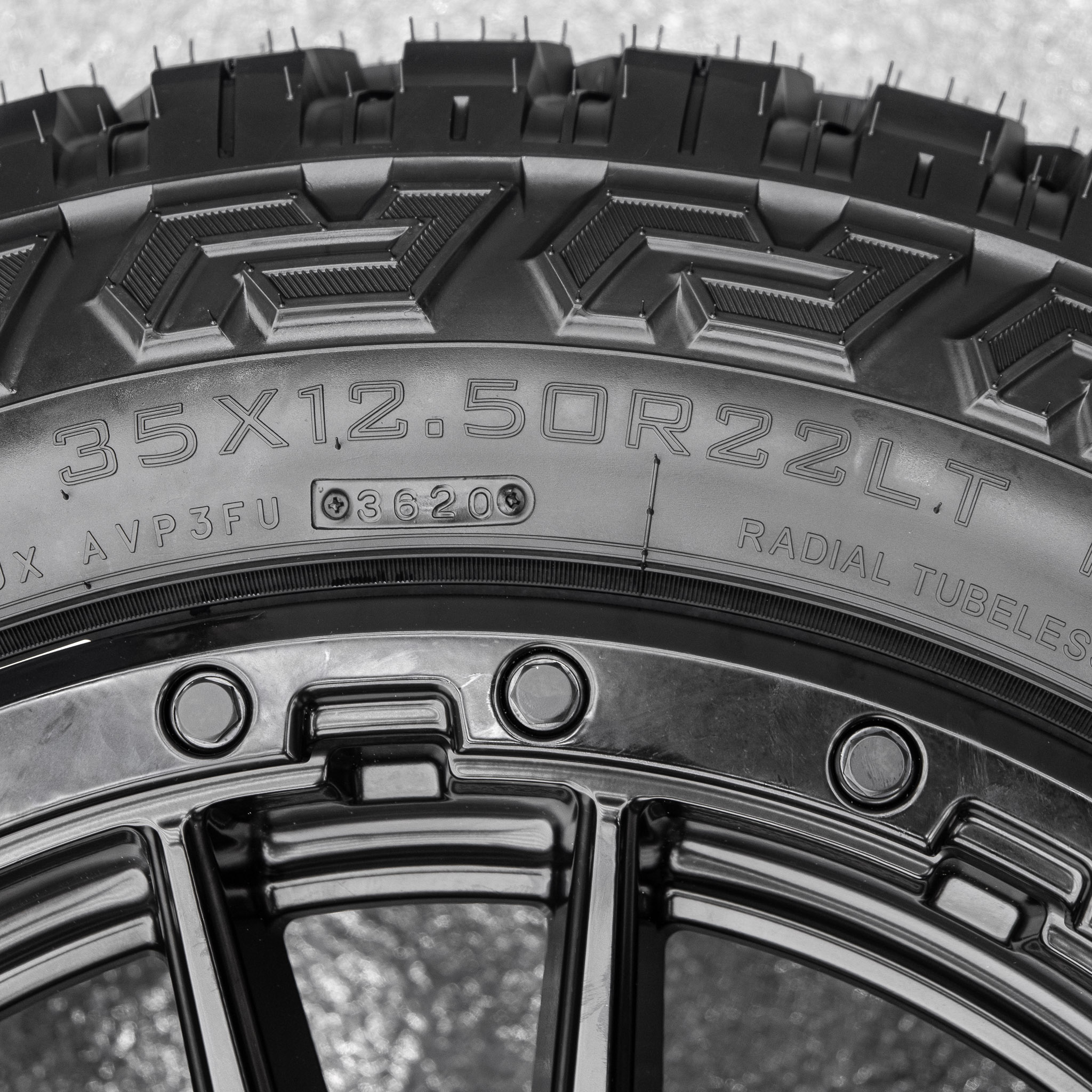 The above reference photo is a wheel size of 22×12, bolt pattern 6×139.7 with a -44 offset and a tire size of 35X12.50R22LT