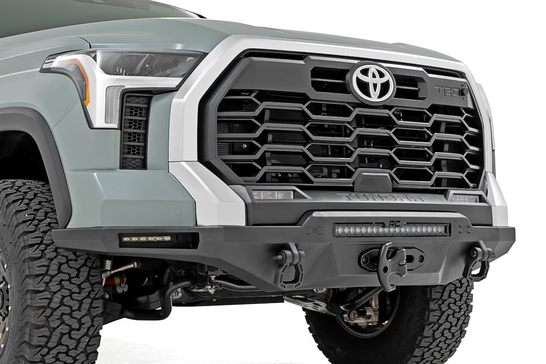 | Features | 11 Gauge Main Skin | 7 Gauge Inner Structure and Winch Tray: Heavy duty steel construction delivers exceptional impact resistance, reinforced by a robust inner structure and integrated winch tray built to handle extreme off-road recovery demands.\ Modular Configuration for Customization: Versatile modular design allows you to tailor lighting and accessory options, creating a personalized off-road setup that matches your Toyota Tundra build and driving style.\ Includes Block-Off Panels for Non-Optioned Kits: Precision-fit block-off panels are included to maintain a clean, finished appearance when optional lighting or accessories are not installed.\ Heavy Duty Recovery Points for 3/4 Inch D-Rings: Integrated recovery points accept standard 3/4 inch D-rings with a 7/8 inch pin diameter, providing dependable strength for vehicle recovery and trail assistance.\ Parking Sensor Ready: Designed to retain factory parking sensor functionality, ensuring OEM-level convenience and safety without compromising bumper strength or appearance.\ Smoked Amber LED Sensor Hole Covers Included: Comes with smoked amber LED lights to cleanly block off parking sensor openings on non-optioned trucks while adding a subtle custom lighting accent.\ Optional 6 Inch Slimline LED Wing Lights: Available with integrated 6 inch slimline LED lights mounted in the wings, producing 4,800 lumens to enhance visibility in low-light and off-road conditions.\ Optional 20 Inch Black Series LED Light Bar: Available with a 20 inch Black Series LED light bar delivering 7,200 lumens of powerful forward-facing illumination for night driving and trail use.\ Winch Ready with PRO Series Compatibility: Available with Rough Country PRO12000S winch or engineered to accept PRO9500 and 12,000 lb synthetic rope winches for secure, reliable recovery performance.\ High Clearance Off-Road Design: Aggressive high-clearance profile improves approach angles and ground clearance, allowing your Toyota Tundra to tackle obstacles with confidence. |