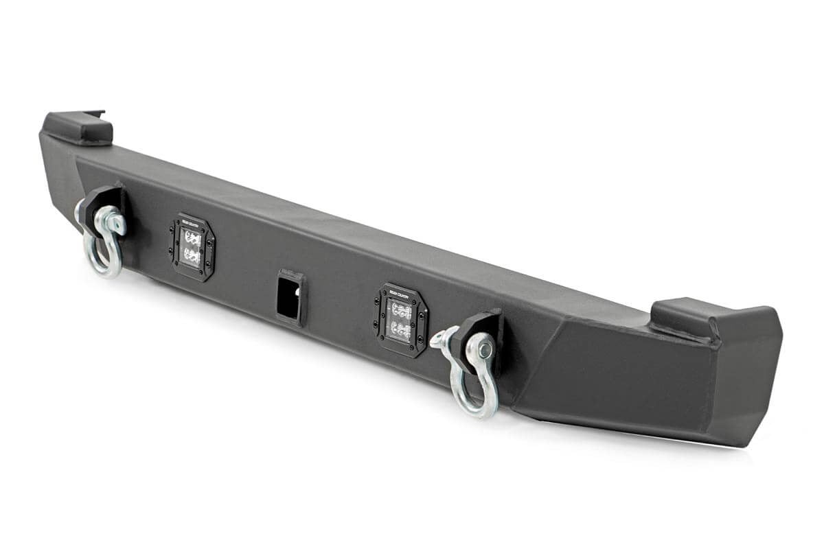Features Hassle-Free Installation: 100% bolt-on design lets you upgrade your Cherokee rear in minutes with no cutting or welding required.\ Bold, Aggressive Style: Give your Jeep a rugged, trail-ready look that stands out on or off the road.\ Built to Last: Heavy-duty steel construction with a durable black carbon powder coat finish resists rust, scratches, and the elements.\ High-Performance Lighting: Includes two flush-mount Rough Country LED lights producing 4800 lumens for superior rear visibility.\ Trail-Ready Recovery Options: Integrated D-ring mounts provide secure attachment points for towing, recovery, and off-road adventures.